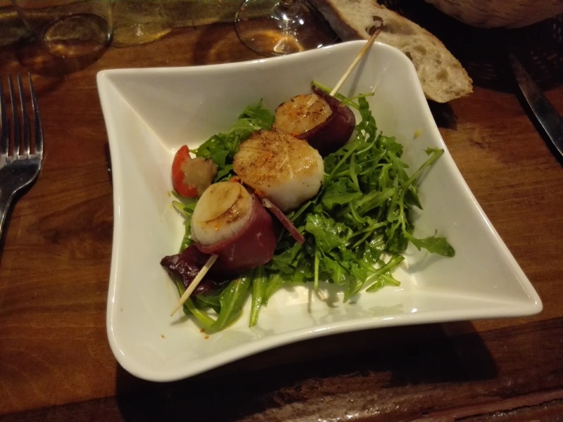 Ensuite le repas se déroule en trois actes : Acte I : Une Saint-Jacques entrelacée de magret de canard fumé, accompagné d’une roquette à la vinaigrette de clémentine.