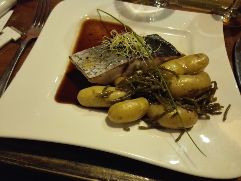 Acte II : Un filet de maigre rôti, avec son jus de viande corsé au cognac, et une poêlée de salicorne et rate au beurre des Charentes A.O.P.