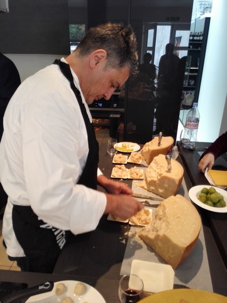 On peut presque tout cuisiner avec du parmesan, avec bien sûr une grande proportion des recettes à bases de pâtes, qu’il soit fondu, râpé, en copeaux ou en morceaux. Notre découvertes s’est faite avec des apéritifs divers, comme une poire avec un filet de vinaigre balsamique accompagnant des morceaux de parmesan 12 mois, une mostarda di clementine sur des morceaux de parmesan 24 mois, des gressini ou des sbrisolona trempés dans du parmesan fondu, des gnocchis frits avec du jambon de parme avec écailles de parmesan et accompagnés d’un Lambrusco, ou encore du saumon avec concombre, crème de raifort et parmesan râpé.