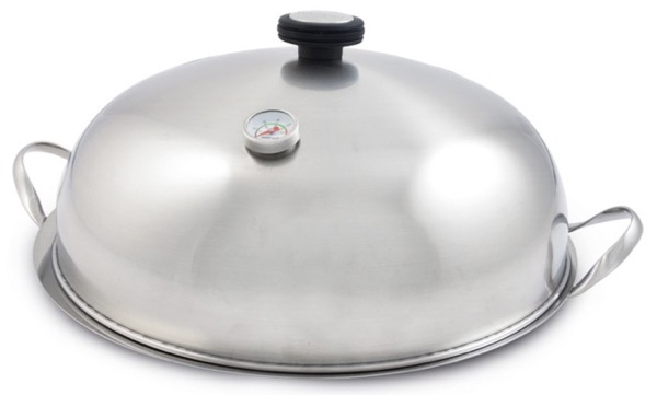 La plancha attire de plus en plus de cuisiniers amateurs, et pas seulement dans le sud-ouest, sa région d’origine. En aparté des modèles à gaz ou électriques, voici un concept original proposé par Mastrad, avec la O’Plancha. En effet, celle-ci se présente sous la forme d’un plateau circulaire en acier inoxydable (à triple fond thermodiffuseur de 8mmm d’épaisseur) et de 32 cm de diamètre, qui est compatible tous feux (gaz, électrique, halogène, induction et même au four ou sur un barbecue). Le combo O’Plancha comporte aussi une cloche en aluminium permettant des cuissons à l’étouffé ou de fumer des aliments, et qui peut faire office de service à table. En accessoires fournis en standard on trouve une grille séparable end eux parties, deux mini maniques et une poire d’aspiration pour les sauces.
