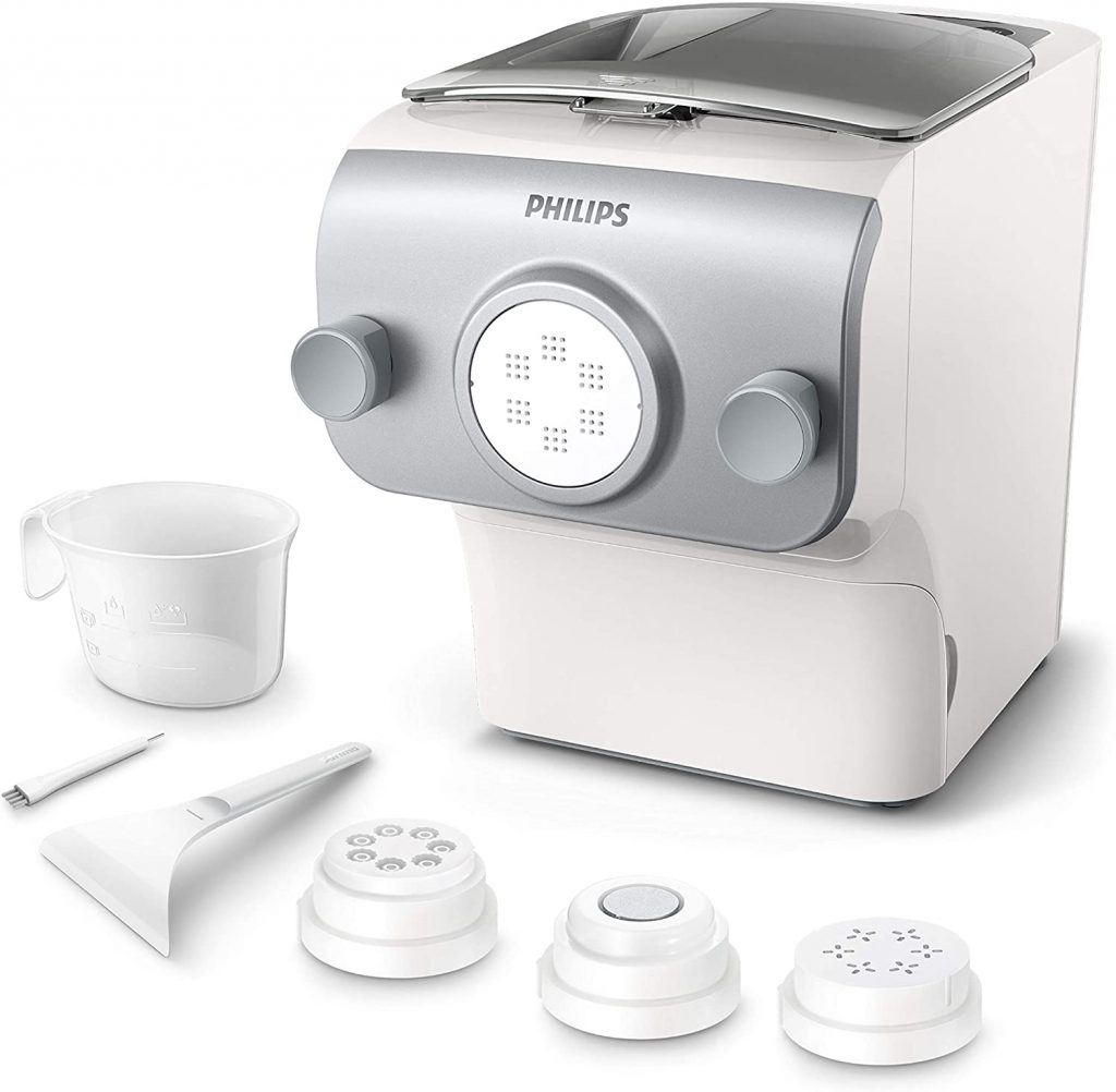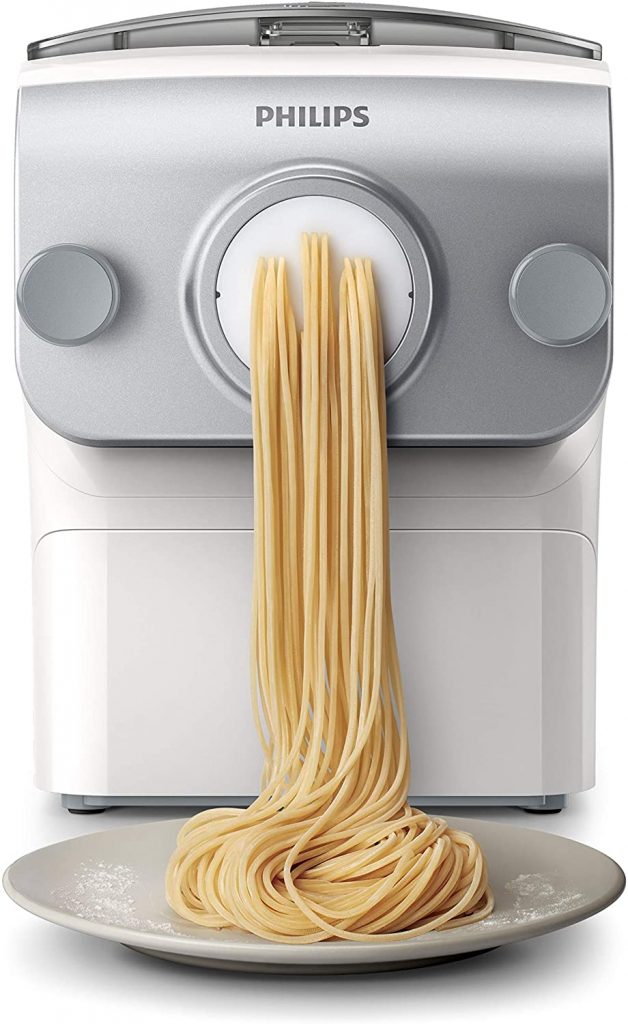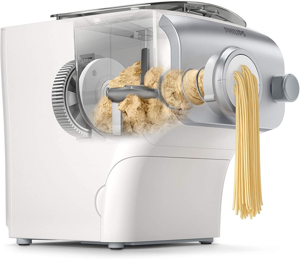 La pâte devrait être à la nouille ce que la Ferrari est à la Fiat Tipo, une spécialité multiforme et multicolore qui n’est plus heureusement exclusivement italienne mais se déguste partout dans le monde. Ceci explique peut être pourquoi la marque Philips, d’origine néerlandaise et donc historiquement liée, même à rebours, à la fondation de la nouvelle Amsterdam (aujourd’hui New-York), à baptisé sa machine à pâte « Pasta Maker », un duo italo-américain qui fleure bon Little Italy et pourquoi pas Cosa Nostra. Joliment carrossé, d’un encombrement raisonnable sur le plan de travail, ce robot culinaire spécialisé revendique une simplicité d’usage exemplaire. Il suffit en effet de placer les ingrédients – farine, sel, eau – dans la cuve qui fait automatiquement le pesage, et de sélectionner le programme après avoir installé la bonne filière destinée à former les pâtes par extrusion. Il faut ensuite appuyer sur le bouton de démarrage et la machine mélange, pétrit pendant le temps approprié puis finalement extrude, le tout automatiquement. La contenance maximale est de 500 grammes de pâtes c’est à dire de quoi produire 5 portions par session. De quoi rassasier une famille normale mais pas pléthorique. De la farine de blé dur et de l’eau seulement ! Le Pasta Maker ne serait-il qu’à la botte de la Botte ? Que nenni !