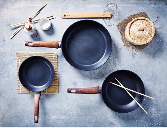 Toujours dans la cuisson – c’est la spécialité de Beka – arrive Yakuro, poêle à frire d’inspiration japonaise en fonte d’aluminium épaisse (3,5 mm) elle aussi, disponible en 3 tailles, antiadhésive,, au bord relevé et queue isolante à l’aspect bois. Elle n’est pas revêtue de PFOA, l’acide perfluorooctanoïque, substance classée « préoccupante » par le règlement Reach de l’UE, mais de deux couches de PTFE renforcé qu’on appelle communément Teflon chez Dupont. Donc à ne pas rayer avec un couvert en métal, ni surchauffer par inattention. Comme tous les ustensiles pareillement protégés, il sera nécessaire de changer cette poêle au bout d’un certain temps ce qui n’est pas fait pour déplaire à Beka, évidement, qui garantit quand même l’ustensile durant 5 ans. Tout comme la cocotte papillon, la poêle Yakuro est compatible tous feux.