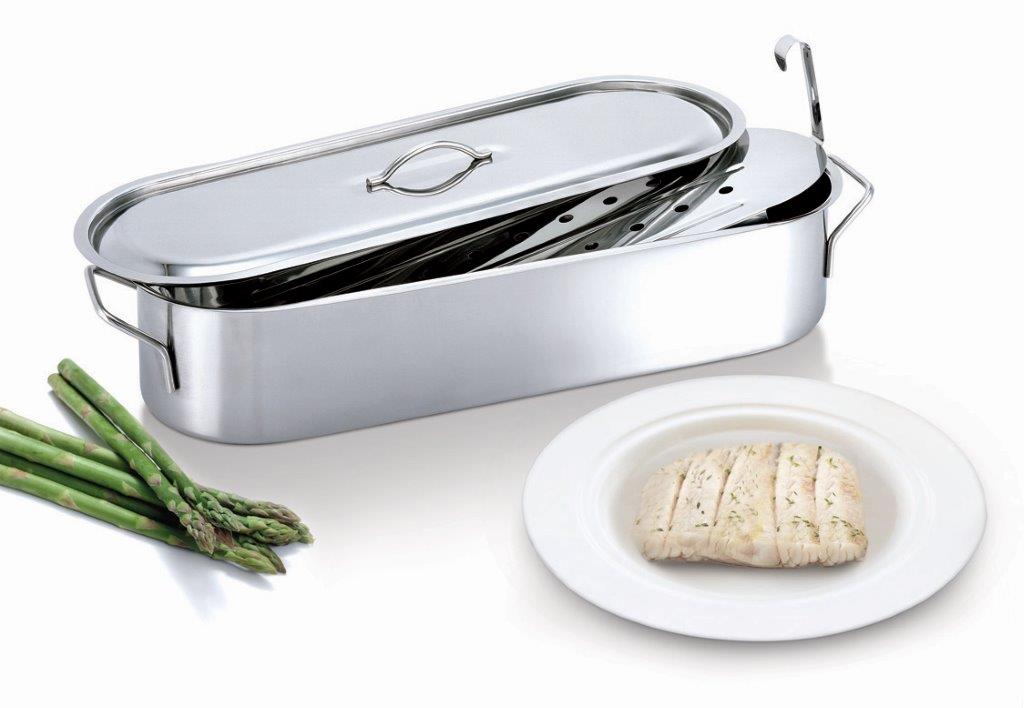 Poissonnière de 50 cm : 53€ ; Combiné vapeur Polo 3 éléments avec couvercle : 75,50 cm ; passoire Chef triple diamètre : 48 €